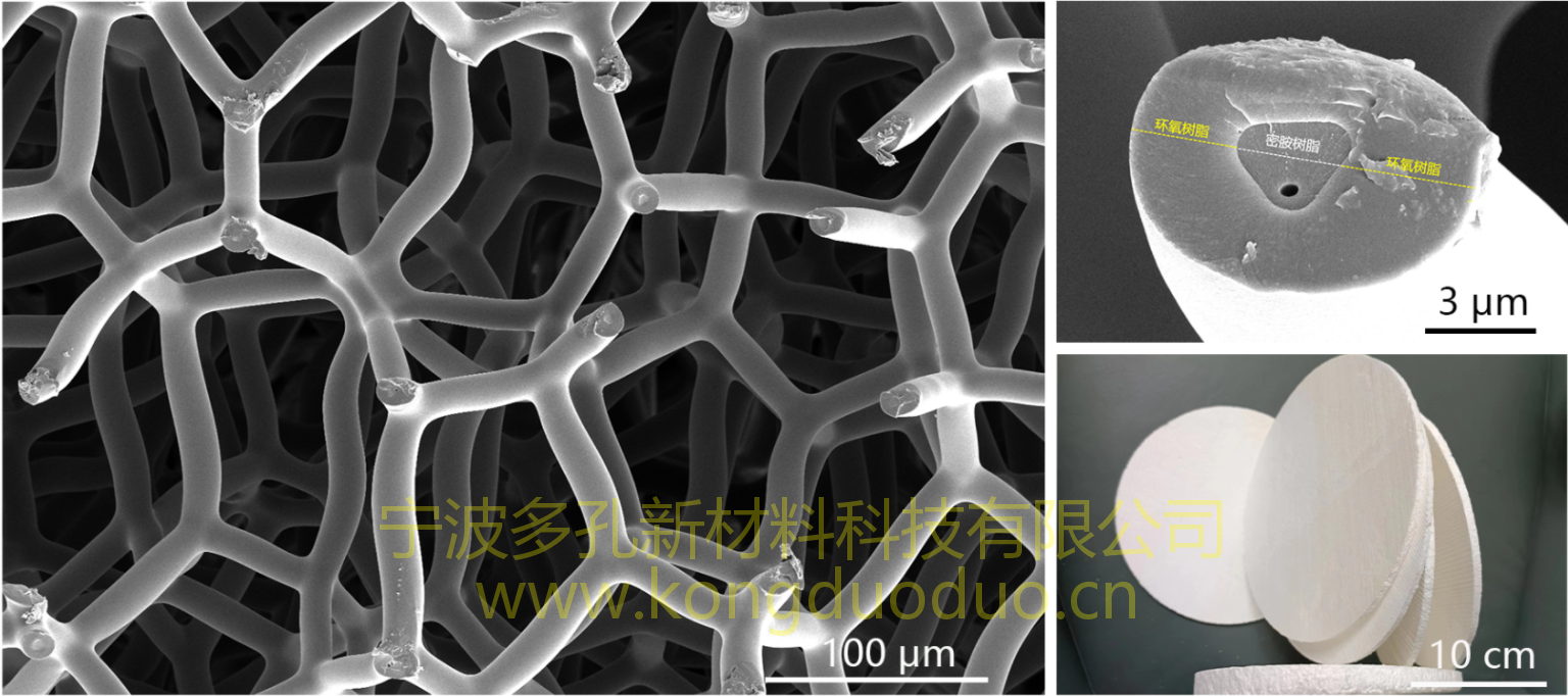 1)升級增值:在納米尺度下環氧樹脂精準復制密胺骨架及其結構,并對其進行增強改性,骨架粗細為3~5μm,其中密胺骨架是三聚氰胺甲醛聚合物其粗細2~4μm,環氧樹脂厚度為0.5~2μm,孔率可達到92%以上,質量輕盈,其密度在18~30kg/m3。