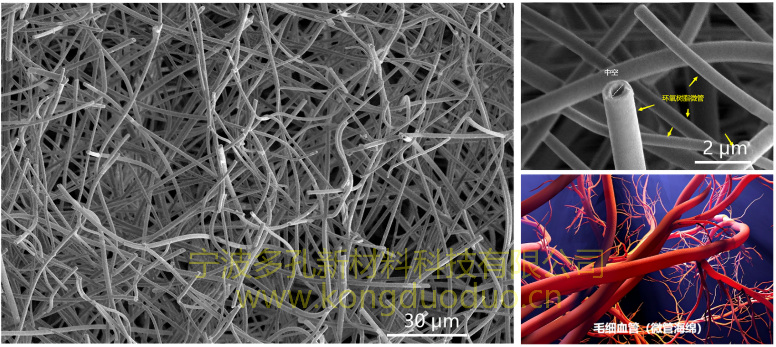 2)材料一次成型:可獲得任意尺寸的由中空微管組成的三維網狀結構的特殊開孔海綿。